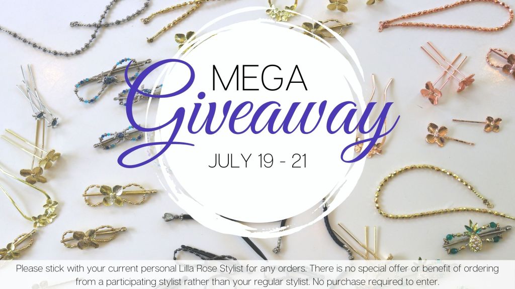 The Fine Print: This giveaway is hosted by a group of Lilla Rose Independent Stylists and is in no way sponsored, endorsed, or administered by, or associated with, Facebook, Instagram, WordPress or Lilla Rose, Inc. You understand that you are providing your information to your personal Independent Stylist and temporarily to the administrator of the giveaway only, which they will use to communicate with you about the giveaway, announce winners, special offers, and helpful hair tips and tutorials. You may unsubscribe at any time. Total prizes valued at over $1500. There will be one grand prize winner of a $500 and a $100+ Lilla Rose hair accessory gift set. There will be one second place winner and one third place winner of gift sets valued at over $100 each (actual gift set contents may vary from photos shown) and more than 50 winners of $17 Lilla Rose gift certificates. Giveaway open to U.S. residents only. No purchase necessary. Grand prize winners will be announced through email on Thursday, July 22, 2021 and will have 48 hours to claim their prize. Gift certificate winners will be notified on Monday, July 26, 2021. Lilla Rose Stylists and their immediate family are not eligible. Please stick with your current personal Lilla Rose Stylist for any orders. There is no special offer or benefit of ordering from a participating Stylist rather than your regular Stylist.