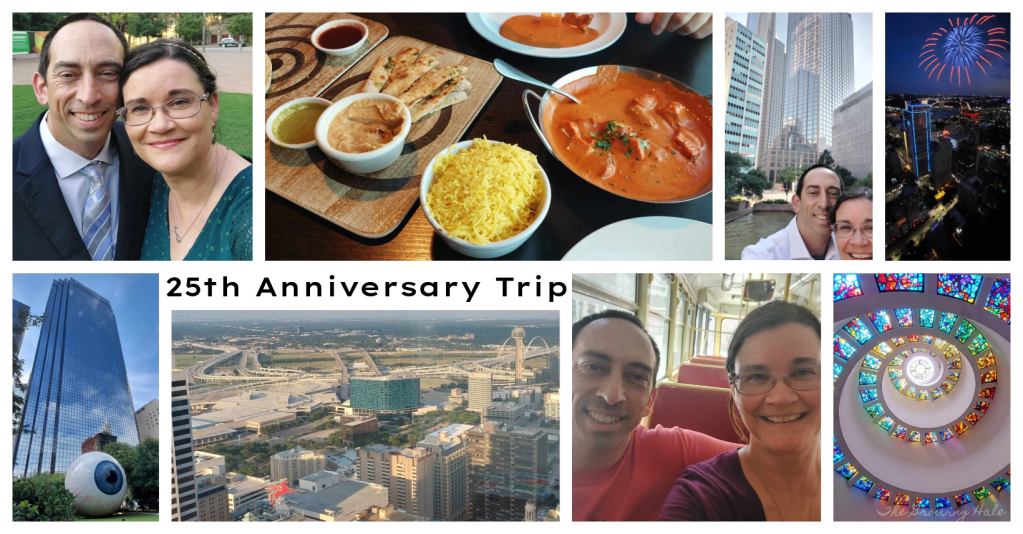My husband and I just celebrated our 25th anniversary! We kinda did a staycation in that we stayed local (only an hour from home), but we did leave the country and our room was on the 49th floor of a 50 story building in downtown Dallas! We enjoyed some tasty food and different scenery from the country life. As a souvenir, I got some lemongrass and a succulent at a nursery in the Dallas Farmer’s Market. 🙂