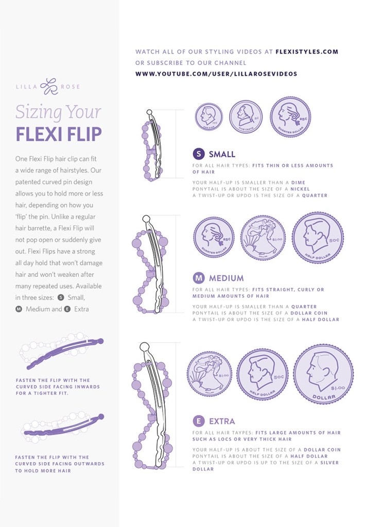 The Flexi Flip is the latest update of our signature Flexi-Clip – it is our most versatile product. Available in three sizes, it “flips” to secure several different hair styles ranging from less to more hair as shown above.